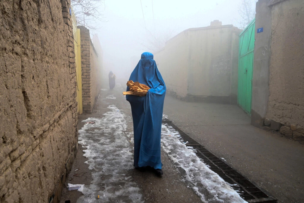 Uma mulher caminha por uma estrada em direção à sua casa depois de receber pão da campanha Salve os Afegãos da Fome, em Cabul, Afeganistão, em 18 de janeiro.