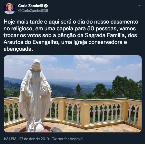 As denúncias de agressões, assédio sexual, tortura e estupro contra menores também não impediram que a deputada defensora da família e dos bons costumes, Carla Zambelli, se casasse numa igreja dos Arautos do Evangelho.