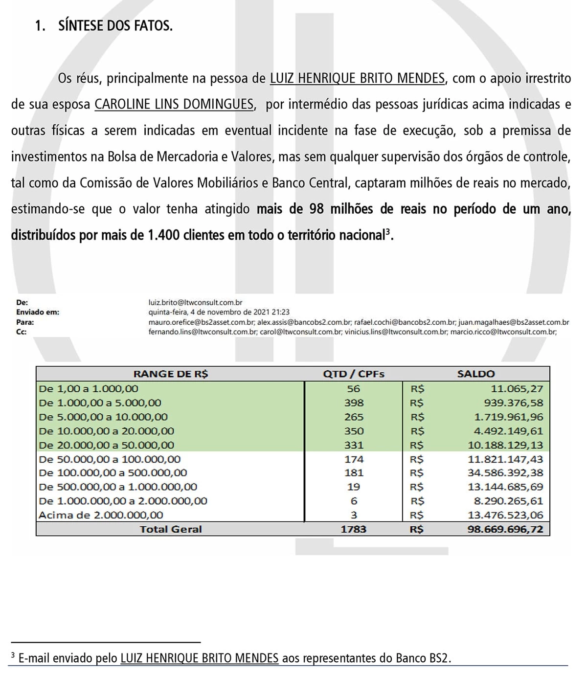 Francisco relatou que, nas reuniões presenciais com Brito, ele chegava a exibir a tela do computador para provar que a LTW não estava quebrando. “Ele sempre mostrava o sistema dele e falava: ‘Olha, eu tenho R$ 50 milhões aqui. Eu tinha R$ 80 milhões, mas ainda tenho R$ 50 milhões. Estou operando normalmente’. Ele me mostrou extrato falso, começou a mandar boletas falsas, a fazer agendamentos de pix que não eram pagos”.
