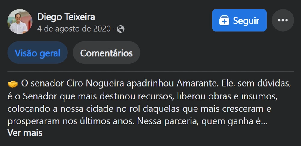 O prefeito de Amarante é visita frequente no gabinete do presidente do FNDE em Brasília. No Facebook de Diego Teixeira, há registro de seis reuniões entre ele e Marcelo Ponte desde 2020. O município está entre os 50 do Piauí que receberam mais transferências voluntárias, aquelas que estão mais sujeitas a acordos políticos – cerca de R$ 237 mil.