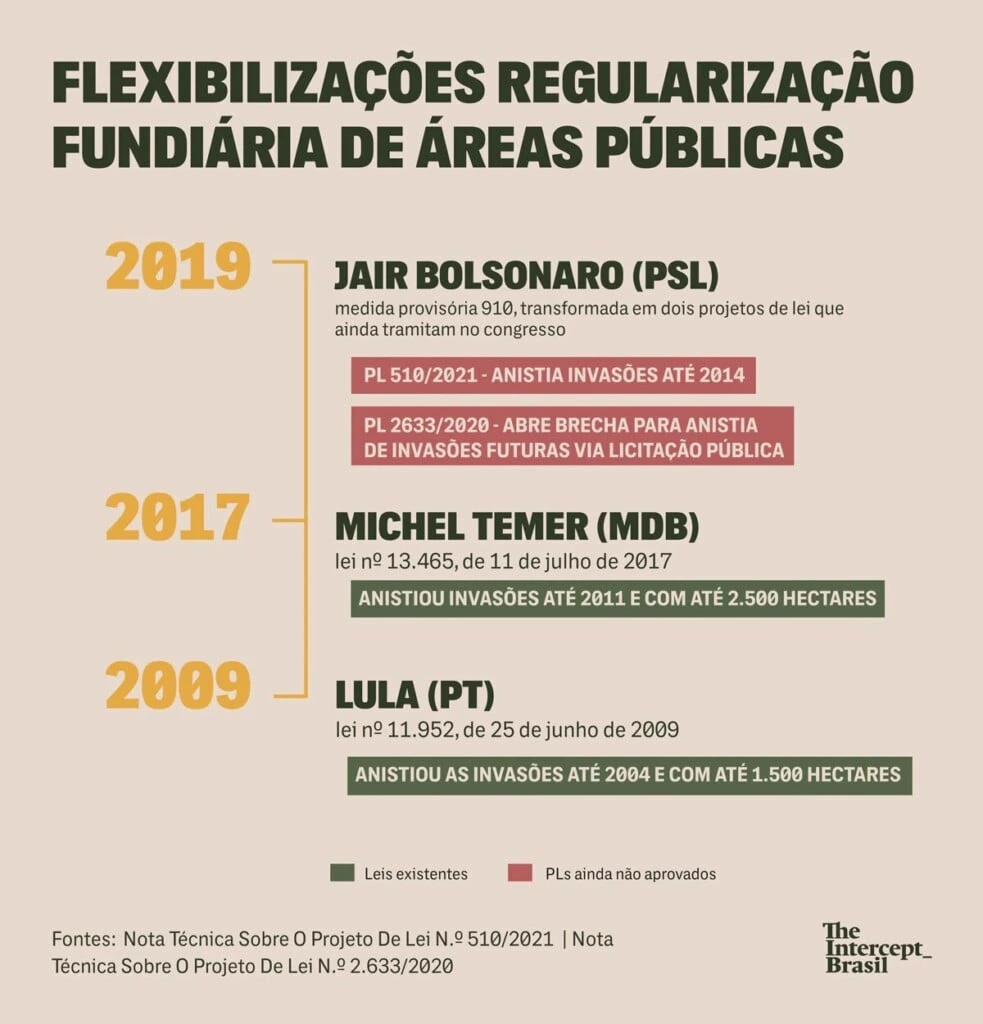 Em 2019, o presidente Jair Bolsonaro criou a expectativa de uma nova rodada de anistias com a edição da Medida Provisória 910, a MP da Grilagem, que depois de perder a validade acabou por ressurgir na forma de dois projetos de lei patrocinados pela bancada ruralista. Eles aguardam votação no Congresso.