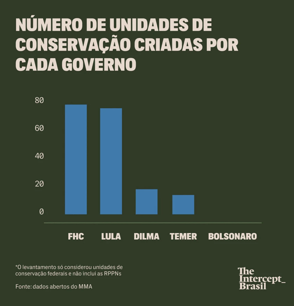 Já o ritmo de criação de unidades de conservação federais vem caindo desde o governo da petista Dilma Rousseff. Foram 77 na gestão de Fernando Henrique Cardoso, 75 nos dois governos Lula, 16 no período Dilma e 13 na gestão de Michel Temer — o levantamento não considera reservas particulares do patrimônio natural, as RPPNs.