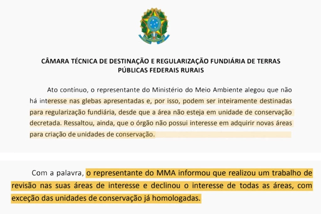 “O representante do MMA [Ministério do Meio Ambiente] informou que realizou um trabalho de revisão nas suas áreas de interesse e declinou o interesse de todas as áreas, com exceção das unidades de conservação já homologadas”, registrou-se em ata da reunião da câmara técnica, em 26 de agosto de 2020.