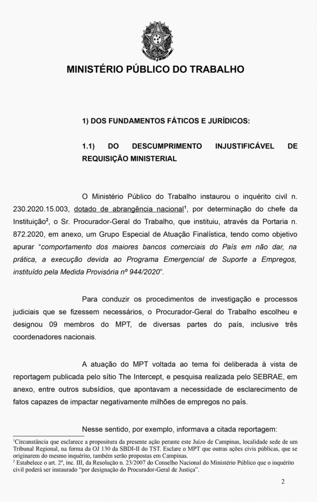 Os procuradores requisitaram às instituições informações e documentos que comprovassem a implementação do Programa Emergencial de Suporte a Empregos. De todos, apenas o Itaú prontamente respondeu os questionamentos – as informações prestadas levaram o MPT a descartar irregularidades. Mas os outros bancos, segundo os procuradores, foram por outro caminho e “tentaram impedir a atividade investigatória”, segundo argumentaram em uma ação.
