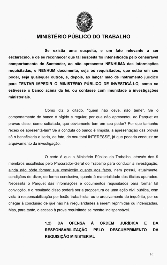 A Federação Brasileira dos Bancos, Febraban, e o próprio Santander ainda chegaram a entrar com dois mandados de segurança para travar a investigação. A ação da Febraban chegou a paralisar o inquérito, mas depois foi derrubada pelo Tribunal Regional do Trabalho da 15ª Região, o TRT-15. “Não vislumbro qualquer irregularidade perpetrada pelo Ministério Público do Trabalho”, decidiu o desembargador Antonio Francisco Montanagna.
