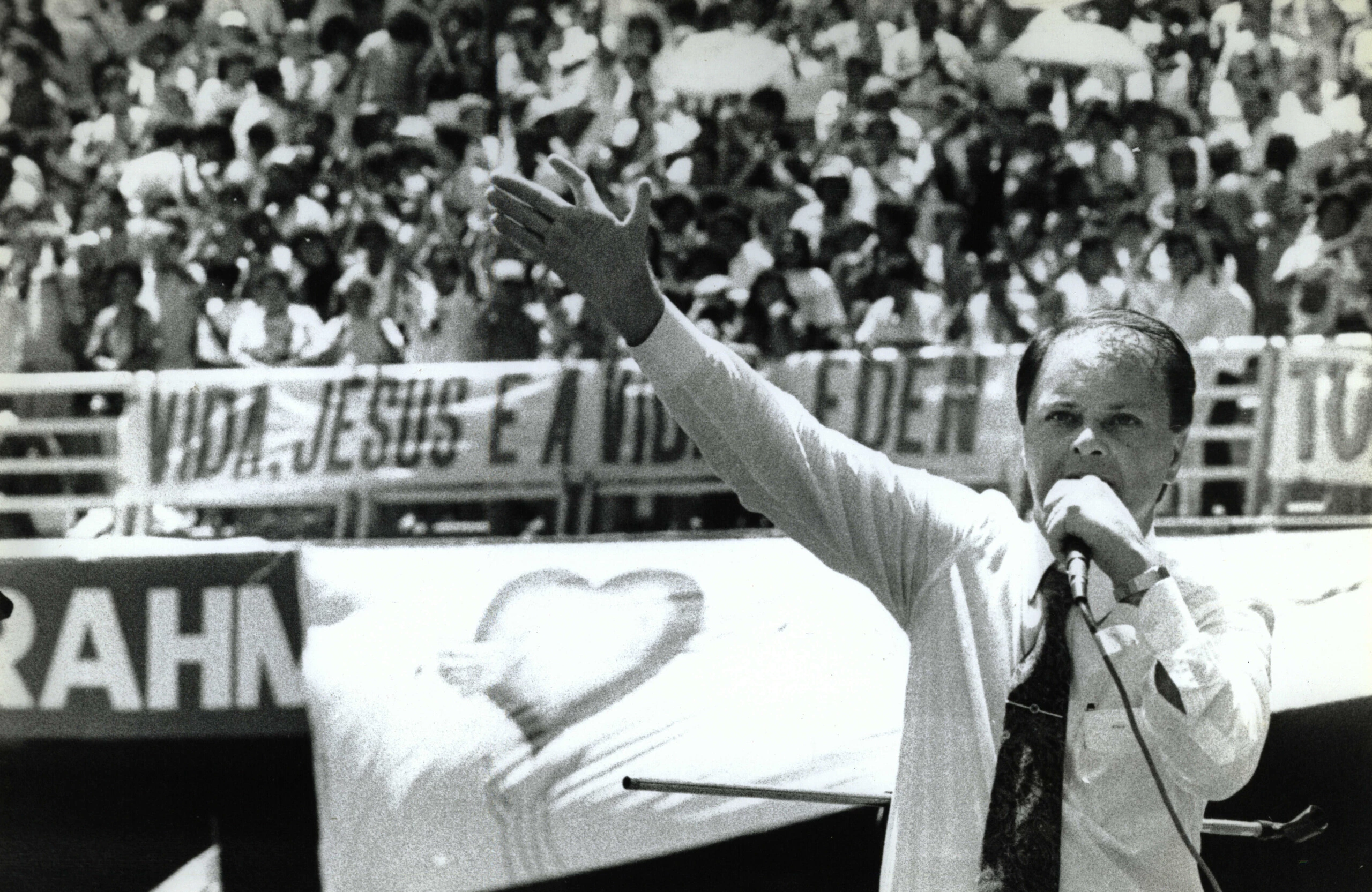 Edir Macedo fala a fieis no estádio do Maracanã em 1990. (foto: Fernando Rabelo/Folhapress)