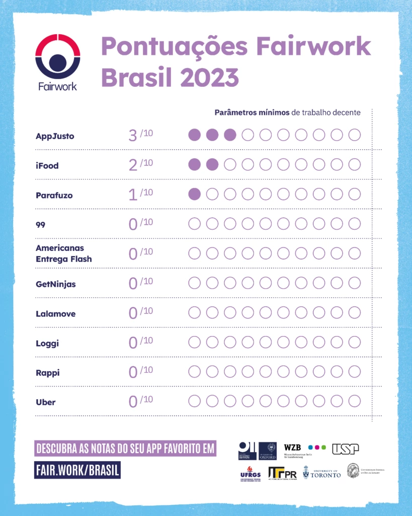 Falta muito para o mínimo. Essa é a conclusão do segundo relatório da Fairwork, organização internacional que avalia as condições de trabalho em plataformas digitais como a Uber, Loggi e iFood. No Brasil, quando se fala de mínimo, é o mínimo mesmo: salário mínimo, fornecimento de equipamentos e treinamento para saúde e segurança, contratos justos, canal de comunicação e liberdade de associação dos trabalhadores.