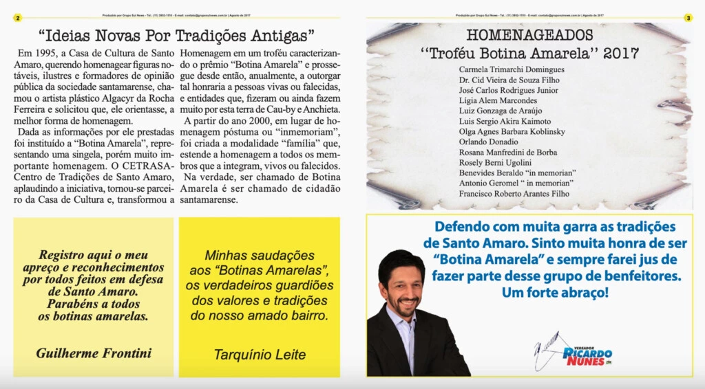 “Fui homenageado pelo Cetrasa com uma das personalidades da região. E isso muito me orgulha!”, disse Nunes na ocasião. Em 2017, o então vereador publicou um anúncio de seu próprio mandato em uma edição especial do Troféu Botina Amarela, publicada pelo Grupo Sul News como um encarte da Gazeta de Santo Amaro. “Sempre farei jus de fazer parte desse grupo de benfeitores”, escreveu.