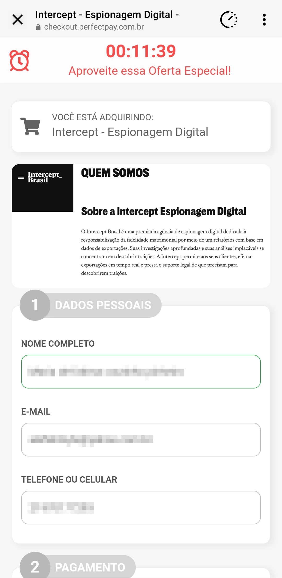 O suposto serviço usa como plataforma de pagamentos a PerfectPay. Na propaganda, o falso Intercept se apresenta com uma versão alterada do texto institucional do nosso site, afirmando que é uma “premiada agência de espionagem digital dedicada à responsabilização da fidelidade matrimonial” -– o que obviamente não tem nenhuma relação com o jornalismo, nossa missão.