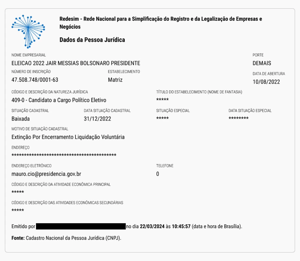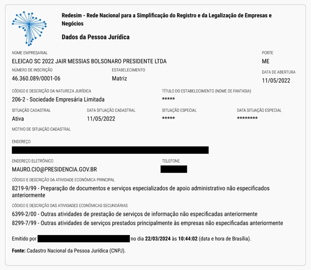 No caso de Bolsonaro, o CNPJ oficial da campanha foi registrado em 10 agosto de 2022 em Brasília. Os dados utilizados no cadastro são os mesmos informados pelo candidato à Justiça Eleitoral. Lá consta o e-mail [email protected].