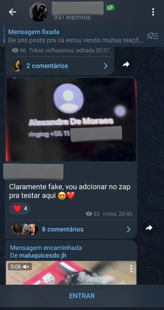Por sinal, a jornalista Letícia Oliveira, que monitora grupos extremistas, publicou prints em que o administrador de outro grupo supostamente neonazista, que reunia mais de 900 pessoas, pedia aos membros para mandarem mensagem e ligar para o número de Alexandre de Moraes – prática conhecida como doxxing, ou assédio online, o que é crime.