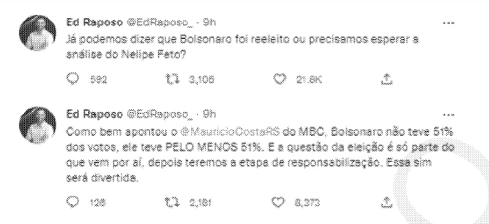 Uma das decisões, por exemplo, do influenciador Ed Raposo, é ilustrativa da gravidade das publicações rechaçadas no Brasil. Aqui estão algumas das frases dos tweets que constam no despacho de Moraes que determinou a suspensão de suas contas: “Se o TSE não aceitar, entra em ação o poder moderador”. “Moraes não vai acatar nada, é bom que todo mundo saiba disso. A solução será outra”. “Bolsonaro não teve 51% dos votos, ele teve PELO MENOS 51%”.