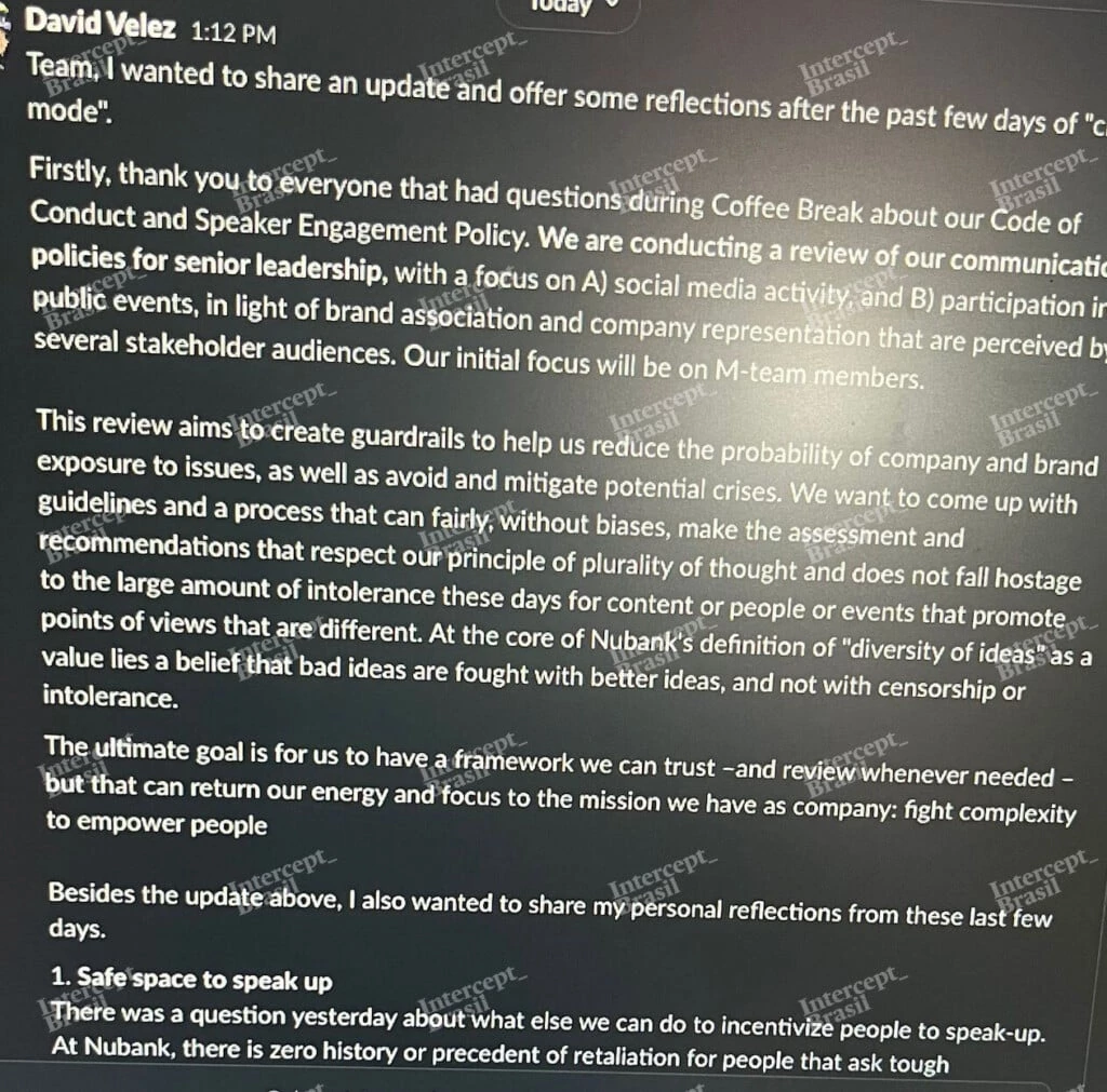 As mensagens do Slack revelam que David Vélez, outro co-fundador do Nubank, escreveu sobre o tema aos funcionários da empresa na tarde da última quinta-feira, 20. Apesar de admitir a necessidade de revisar as políticas de comunicação para a alta liderança e falar que a empresa está em “modo de crise ativado”, ele saiu em defesa de Cristina Junqueira.