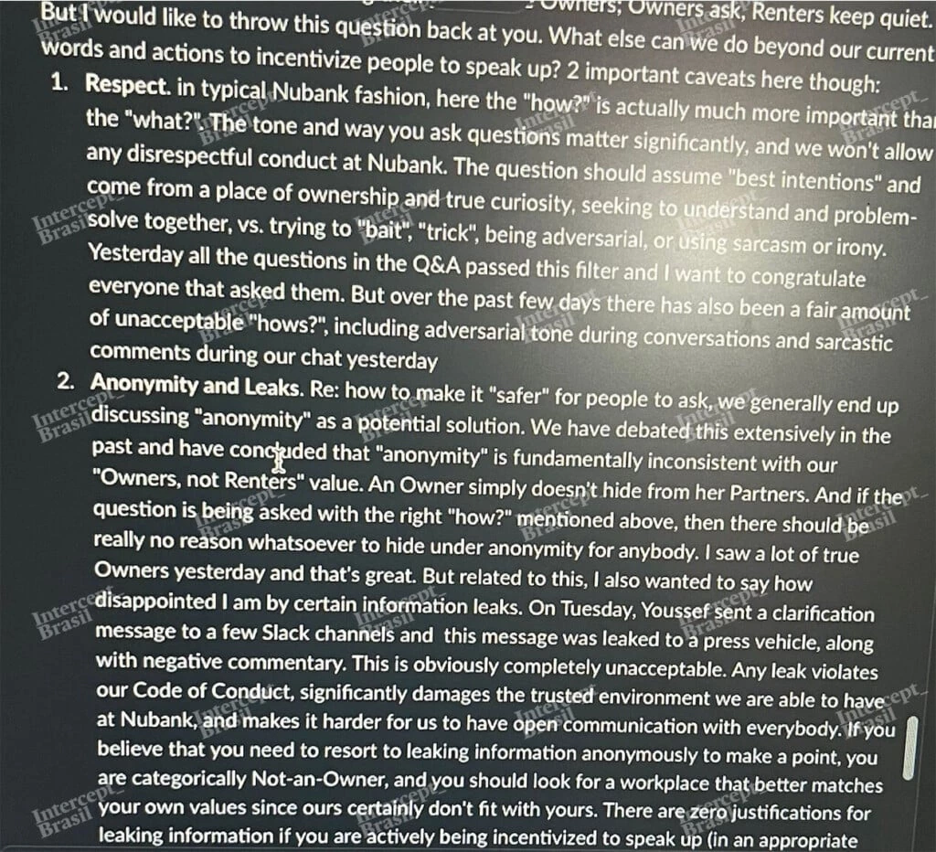 Ao Intercept, o Nubank afirmou que tem orgulho de criar um ambiente de trabalho “seguro e transparente, com uma cultura que ativamente estimula e incentiva questionamentos”. A empresa também afirmou lamentar que conversas internas tenham sido compartilhadas porque “confidencialidade é o alicerce do nosso ambiente plural”. Leia a nota na íntegra no fim deste texto.
