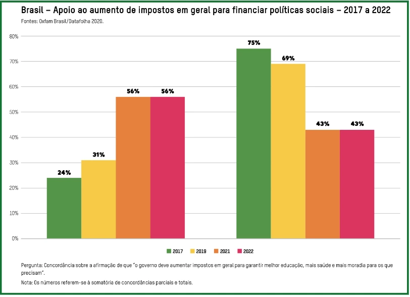 Nos últimos anos, o vínculo entre tributação e financiamento de políticas públicas tem se fortalecido, com 56% da população apoiando aumento de impostos para financiar saúde, educação e moradia, mesmo quando não especificado que seja apenas para os ricos, segundo a Oxfam Brasil (2022).
