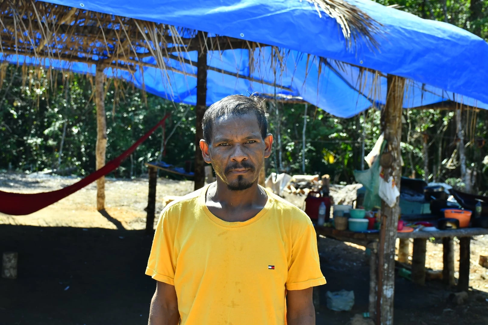 Leonardo e Keriane moram em um espaço sem paredes nem banheiro, com um fogão à lenha. Apesar da situação precária, o casal acredita que a liberação das terras é o caminho para a mudança de vida.