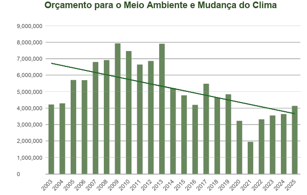 Os dados das últimas duas décadas deixam claro que, conforme a destruição ambiental aumenta, os recursos destinados a combatê-la sofrem uma queda estrutural alarmante, agravando ainda mais a situação.
