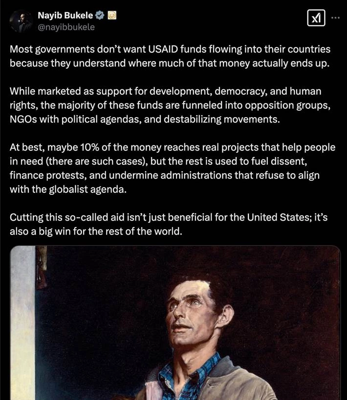 Mas o argumento anti-imperialista de Musk vai além de um emoji. No X, o presidente autoritário de El Salvador, Nayib Bukele — aliás, você sabia que ele é palestino? — criticou a USAID. “Embora sejam divulgados como um suporte ao desenvolvimento, à democracia, e aos direitos humanos, a maioria desses recursos são direcionados a grupos de oposição, ONGs com objetivos políticos, e movimentos de desestabilização”, escreveu Bukele. “Na melhor das hipóteses, talvez 10% do dinheiro chegue aos verdadeiros projetos que ajudam as pessoas necessitadas (esses casos existem), mas o resto é usado para fomentar a dissidência, financiar protestos, e prejudicar os governos que se recusam a estar alinhados com a pauta globalista.”
