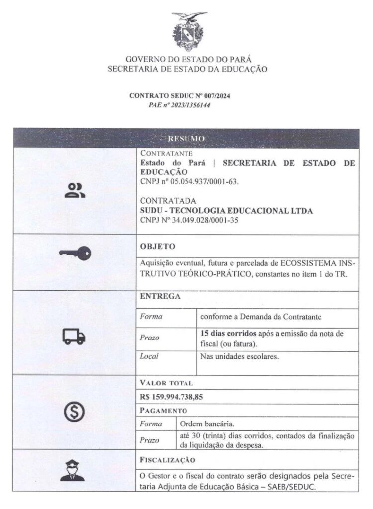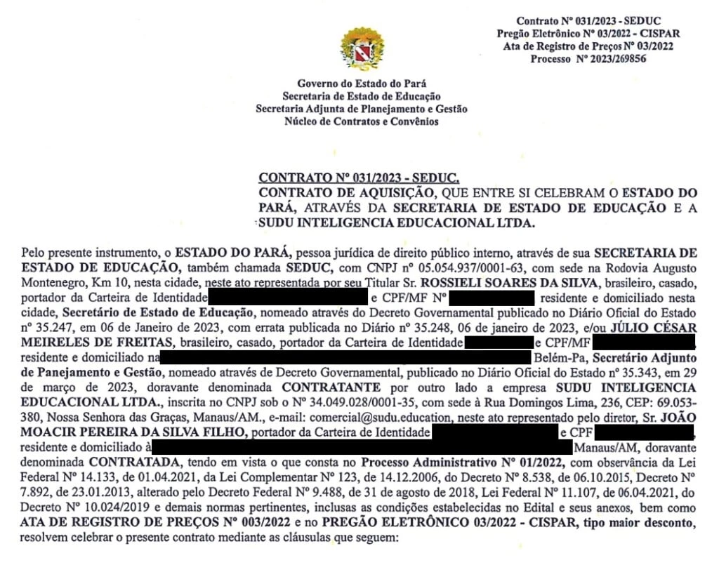 O primeiro contrato entre a Seduc e a Sudu, representante da Somos no Pará, foi firmado no dia 5 de abril de 2023, dois meses depois de Rossieli assumir a Secretaria de Educação do estado.