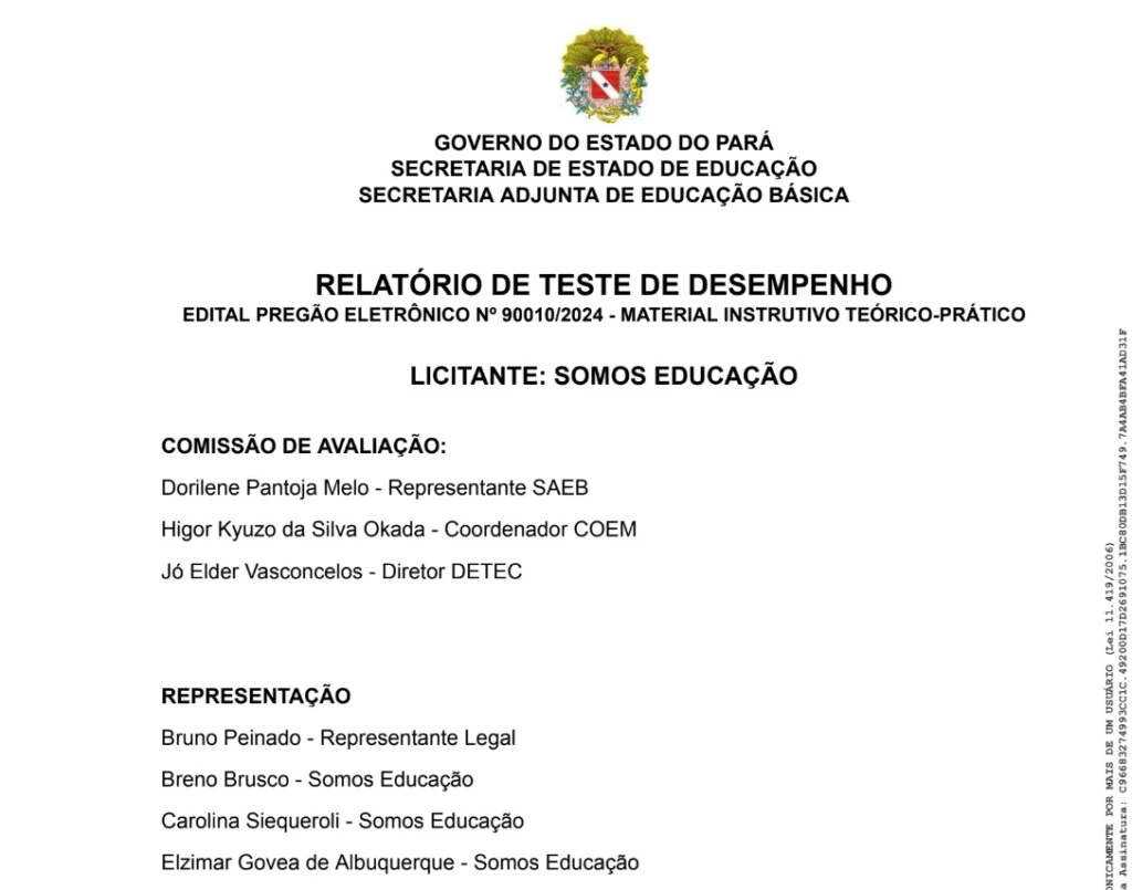 Essa relação ficou explícita ainda no “teste de desempenho” relativo ao Pregão Eletrônico 90010/2024, ocorrido em 12 de junho de 2024. O relatório do teste traz em sua primeira página a informação de que a “licitante” do contrato é a Somos Educação. A empresa enviou a Belém três funcionários para mostrar seus produtos à Seduc, enquanto a Sudu não mandou nenhum.