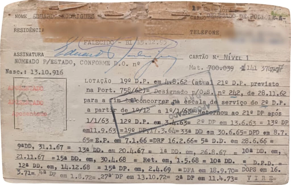 Já a trajetória registrada de Eduardo Rodrigues vai no caminho contrário: ele ingressou na polícia em 1962 e serviu em inúmeros delegacias até ser lotado no DOPS, em março de 1971, poucos meses antes do assassinato de Raul.