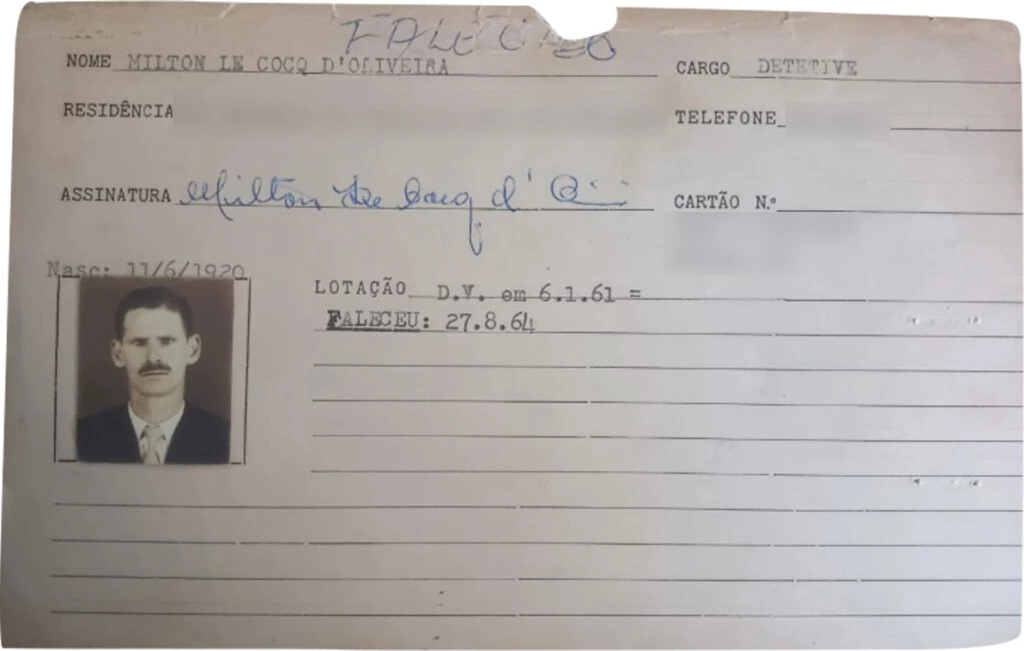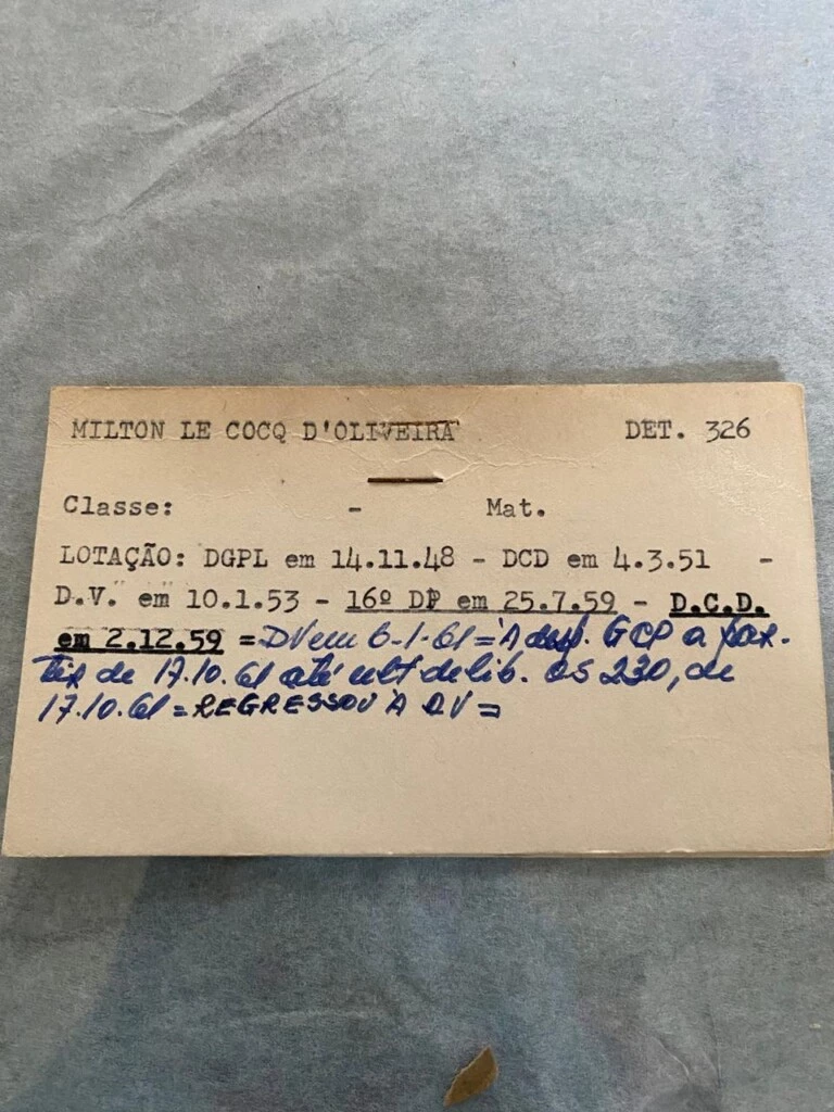 Outra ficha encontrada foi o registro funcional de Milton Le Cocq, policial morto em 1964. Foi em homenagem a ele que se formou a Scuderie Le Cocq, conhecido grupo de extermínio do Rio de Janeiro. O policial, aliás, também é homenageado institucionalmente pela própria Polícia Civil, que conserva um busto de Le Cocq em seu museu, localizado em um prédio anexo ao edifício da Rua da Relação.