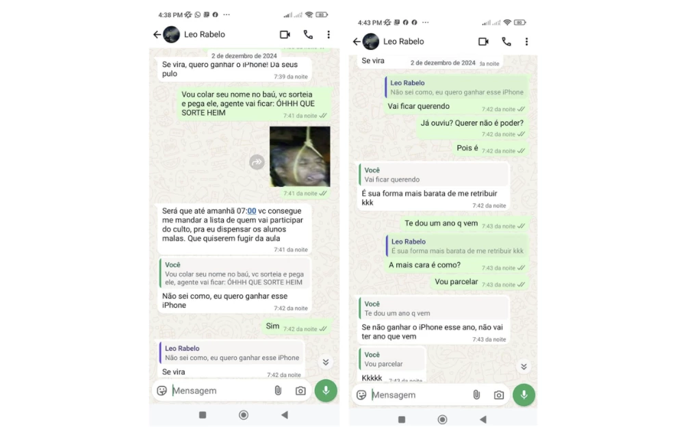“Se vira, quero ganhar o iPhone! Dá seus pulos”, escreveu o sargento para a empresária, em mensagem enviada em 2 de dezembro do ano passado. A frase foi dita no contexto de que haveria um sorteio do aparelho telefônico pela empresa de formatura.