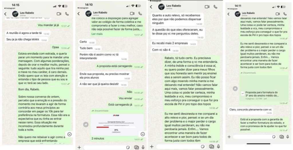 “Sobre nossa conversa de ontem, percebo que a emoção e a pressão do momento me levaram a agir de forma contrária aos meus princípios ao concordar em pagar os R$ 10 mil para ter preferência na formatura”, escreveu a dona da empresa de eventos em mensagem enviada ao sargento e anexada na denúncia. Ela pediu para não ser identificada na reportagem porque teme represálias.