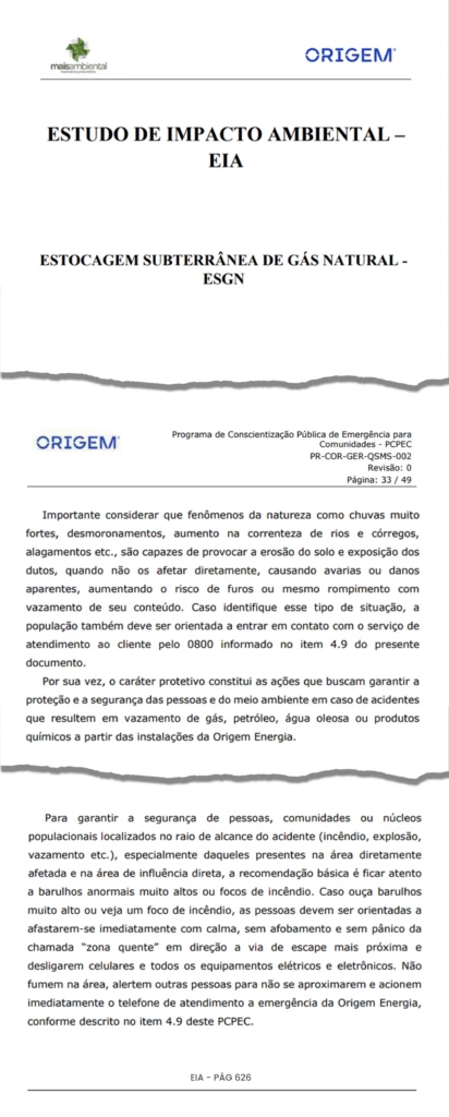 “A Origem Energia possui planos de Resposta a Emergências, Gerenciamento de Estocagem Subterrânea de Gás Natural, Integridade de Instalações e Monitoramento que visam prevenir acidentes e proteger vidas e o meio ambiente”, disse a empresa em nota. Segundo a Origem, esses protocolos incluem o monitoramento contínuo da integridade dos poços e treinamentos periódicos com os colaboradores.