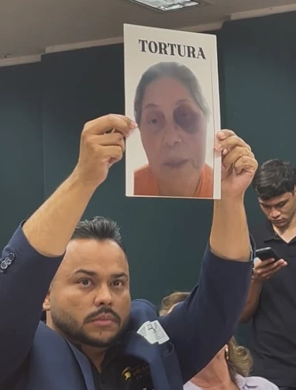 Em 7 de agosto, durante sessão da Comissão de Segurança Pública da Câmara dos Deputados, o advogado de Jucilene, Hélio Ortiz Júnior, ergueu um cartaz com o rosto de sua cliente e a palavra “TORTURA” em letras garrafais. Outros advogados de réus do 8 de Janeiro amplificaram a acusação, e em pouco tempo ela se espalhou em redes bolsonaristas.