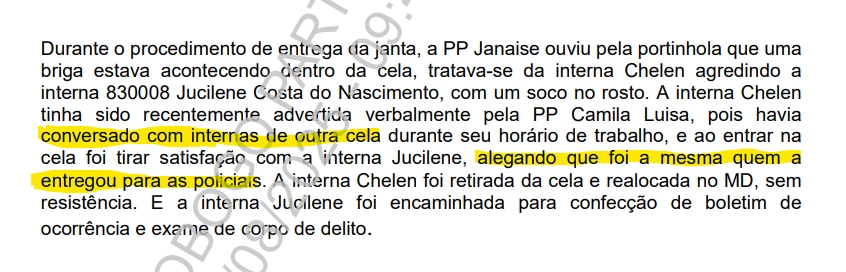 De acordo com os autos, outra detenta desferiu um soco no rosto de Jucilene ao acusá-la de ter “entregado” conversas que ela teve com presas de outras celas às agentes penitenciárias. A intervenção foi imediata: a agressora foi transferida de cela, enquanto Jucilene recebeu atendimento médico, psicológico, exame de corpo de delito e acompanhamento de saúde.