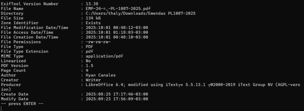 O deputado Diego Garcia disse que a emenda foi elaborada por sua equipe técnica a partir de contribuições do setor produtivo, especialmente da Federação das Indústrias do Paraná, a FIEP. O parlamentar não explicou a digital do IPA nos metadados do documento.
