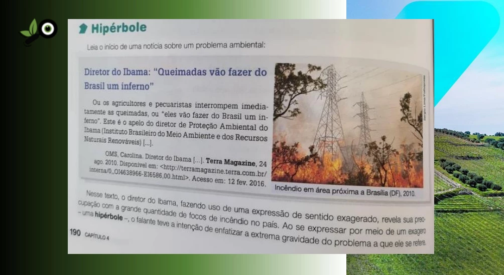 Outro tenta explicar o que é uma hipérbole a partir de uma frase de um diretor do Ibama: “Ou os agricultores e pecuaristas interrompem imediatamente as queimadas, ou eles vão fazer do Brasil um inferno”. Alguns dos exemplos estão disponíveis nesta apresentação feita pela própria Donme.