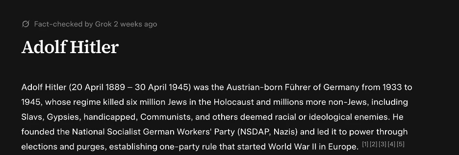 Pegando o verbete sobre Adolf Hitler na Grokipédia. Até o início deste mês, o verbete dizia: “Adolf Hitler, nascido na Áustria, foi o Führer da Alemanha entre 1933 e 1945”. Essa frase foi editada para “Adolf Hitler, nascido na Áustria, foi um político e ditador alemão”, mas o Grok ainda se refere a Hitler por esse honorífico em um parágrafo posterior, onde se lê que Hitler atuou como “Führer und Reichskanzler de agosto de 1934 até seu suicídio, em 1945”. A NBC News também apontou que a página sobre Hitler chegava a 13 mil palavras antes da primeira menção ao Holocausto.